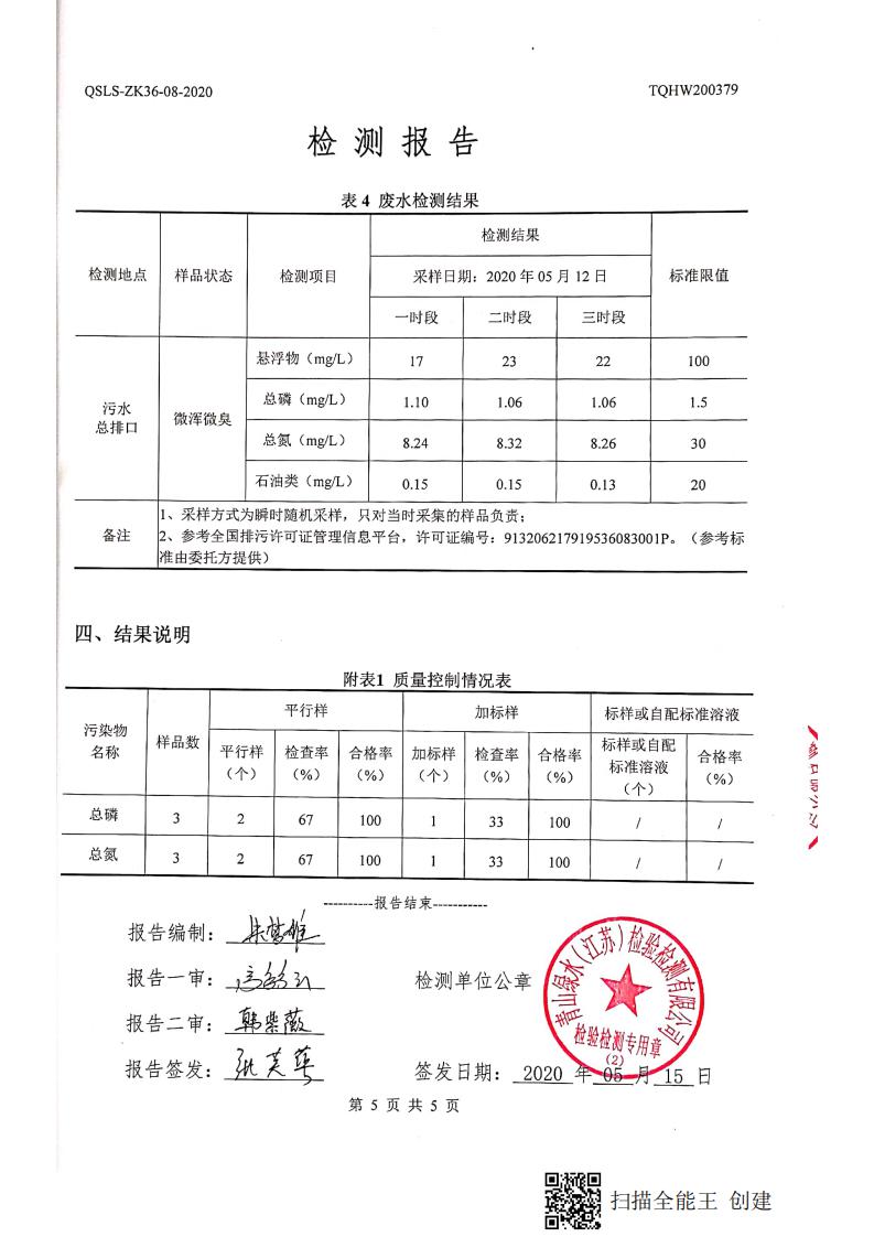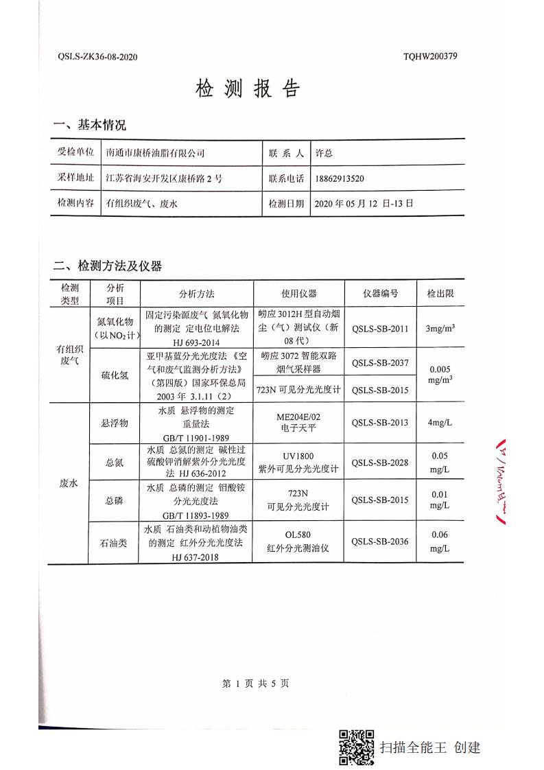 南通市康橋油脂有限公司5月份環(huán)境檢測報(bào)告